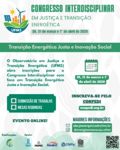 O Observatório de Pesquisa em Justiça e Transição Energética para a Consolidação do Desenvolvimento Sustentável da Universidade Federal de Mato Grosso do Sul (UFMS), com o apoio institucional da UFMS, da Fundação de Apoio à Pesquisa, ao Ensino e à Cultura (FAPEC), da Fundação de Apoio ao Desenvolvimento do Ensino, Ciência e Tecnologia do Estado de Mato Grosso do Sul (FUNDECT), do Conselho Nacional de Desenvolvimento Científico e Tecnológico (CNPq) e do Conselho Nacional de Pesquisa e Pós-Graduação em Direito (CONPEDI), torna pública a abertura das inscrições para o Congresso Interdisciplinar em Justiça e Transição Energética, a ser realizado na modalidade on-line, nos dias 30 e 31 de março e 1º de abril de 2026, com o tema “Transição Energética Justa e Inovação Social”.
