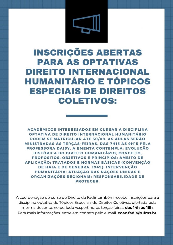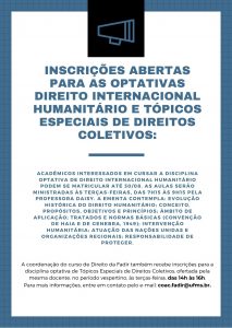 Inscrições abertas para as optativas Direito Internacional Humanitário e Tópicos Especiais de Direitos Coletivos
